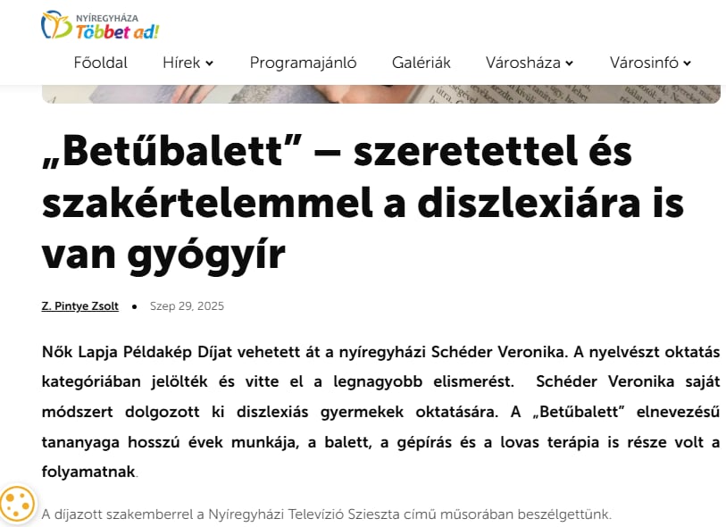 A Betűbalett (nem csak diszlexiásoknak) című mesém a meskete.hu által meghirdetett pályázat egyik nyertese lett, így megjelenési lehetőséget kapott egy nyomtatott mesekönyvben. Ez a történet az alsó tagozatos diszlexiás, diszgráfiás gyermekek számára kidolgozott programom munkaanyagából egy kis ízelítő - fogadják szeretettel!